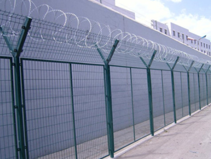機場圍欄網又叫機場刺絲防護網,監獄鋼網墻,是由V型立柱,和框架圍欄網網片組成。加強型焊接網,安全防盜連接件和熱鍍鋅刀片刺籠組成強度和安全防御性級別很高。機場圍欄網被廣泛應用在機場,軍事基地等高安全場所。機場圍欄網頂部加裝刀片刺絲、刀片刺繩后又很好的增強了安全防護性能。采用電鍍、熱鍍、噴塑、浸塑等防腐形式,具有很好的抗老化、抗曬、耐候等特點。其產品造型美觀、花色多樣,既起到圍欄作用,又起到美化作用。由于具有安全性高、防攀爬能力好,網片連接方式采用特制SBS緊扣件,有效防止人為的破壞性拆卸,橫向四道折彎加強筋,使網面強度顯著增加。